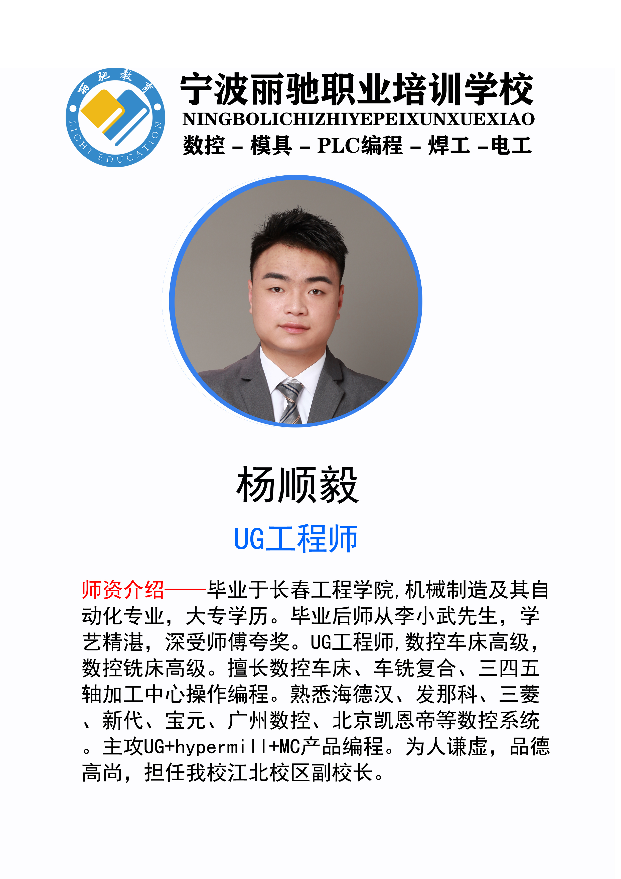 毕业于长春工程学院,机械制造及其自动化专业,大专学历。毕业后师从李小武先生,学艺精湛,深受师傅夸奖。UG工程师,数控车床高级,数控铣床高级。擅长数控车床、车铣复合、三四五轴加工中心操作编程。熟悉海德汉、发那科、三菱、新代、宝元、广州数控、北京凯恩帝等数控系统。主攻UG hypermill产品编程。为人谦虚,品德高尚,是我校优秀的实习老师。